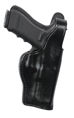 HIGH-RIDE – AUTOMATICS & REVOLVERS – On or off duty holster, designed to ride high, fits very close to the body. Open bottom with thumb break. A polyethylene layer adds extra strength and durability. Also has molded sight tunnel.  Fits belts up to 2 1/4".
