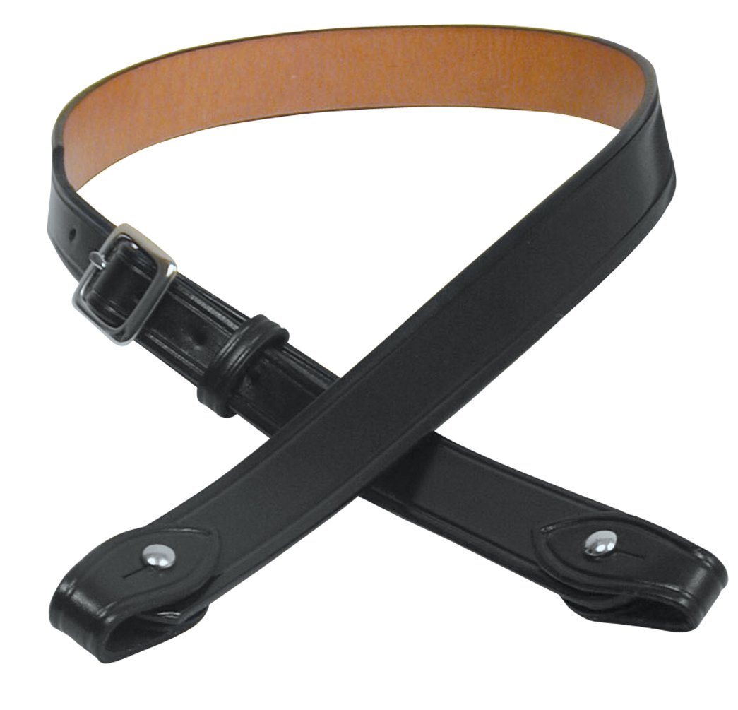 This shoulder strap is made from 8/9oz. cowhide 1 1/4 inch wide. Features are pivoting dee ring connectors, to be used with a dee ring gun belt or with the S507 attachment.